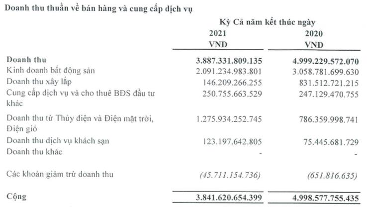 Trong cơ cấu doanh thu cả năm của công ty, mảng kinh doanh bất động sản đóng góp nhiều nhất với hơn 2.091 tỷ đồng, giảm 32% so với cùng kỳ. Tiếp đó doanh thu từ thủy điện và điện mặt trời đạt gần 1.276 tỷ đồng, tăng 62% so với cùng kỳ.