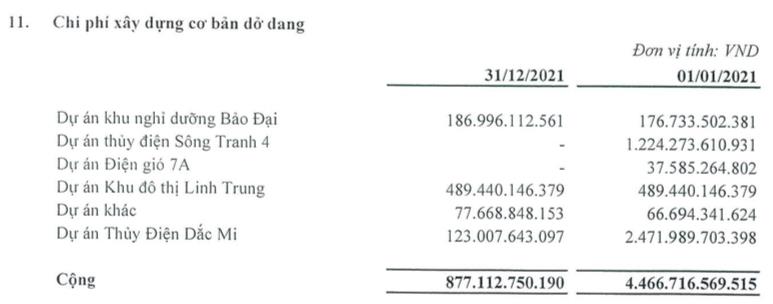 Hàng tồn kho ghi nhận giảm 25% về gần 1.317 tỷ đồng, chủ yếu giảm bất động sản đang xây dựng (từ hơn 1.655 tỷ đồng về hơn 1.074 tỷ đồng). Ngoài ra, doanh nghiệp còn hơn 877 tỷ đồng chi phí xây dựng cơ bản dở dang, tập trung chủ yếu tại ba dự án là Khu đô thị Linh Trung (hơn 489 tỷ đồng), Khu nghỉ dưỡng Bảo Đại (gần 187 tỷ đồng) và Thủy điện Dắc Mi (123 tỷ đồng.