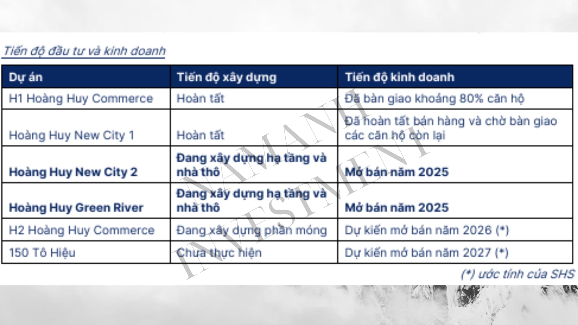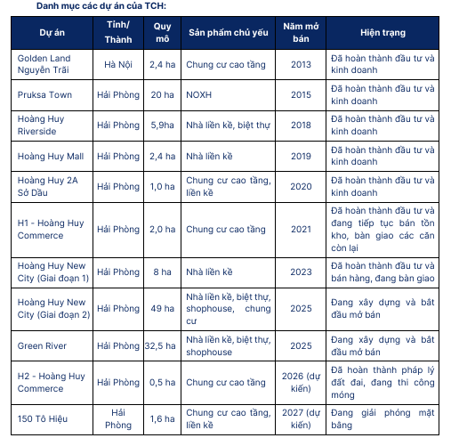 Dự phóng Kết quả kinh doanh mảng BĐS của TCH: Việc mở bán 02 dự án Hoàng Huy New City GĐ 2 và Hoàng Huy Green River từ đầu năm 2025 với các sản phẩm liền kế thấp tầng (thời gian xây dựng và bàn giao nhanh) do đó các dự án này được kỳ vọng giúp TCH đạt kết quả kinh doanh tích cực trong những năm tới.