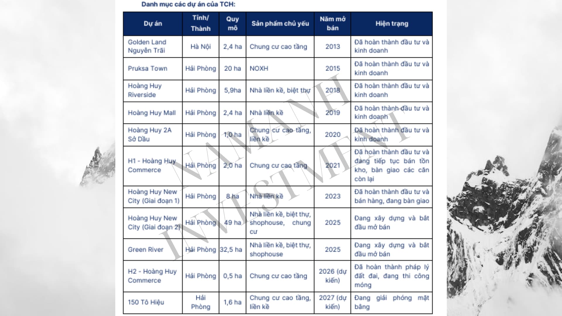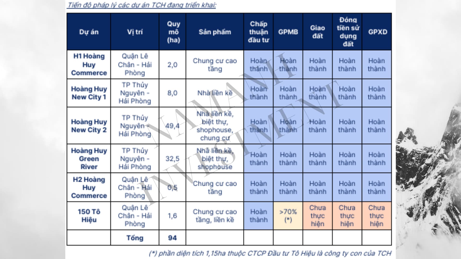 Hiện TCH đang phát triển quỹ đất trên 94ha tập trung tại Hải Phòng, trong đó đáng chú ý là 02 dự án quy mô lớn nhất Hoàng Huy New City GĐII và Hoàng Huy Green River tại Thành phố Thủy Nguyên đều đã sẵn sàng để đưa vào kinh doanh. Điểm tích cực là các dự án đã cơ bản hoàn thiện pháp lý (ngoại trừ dự án 150 Tô Hiệu đang giải phóng mặt bằng).