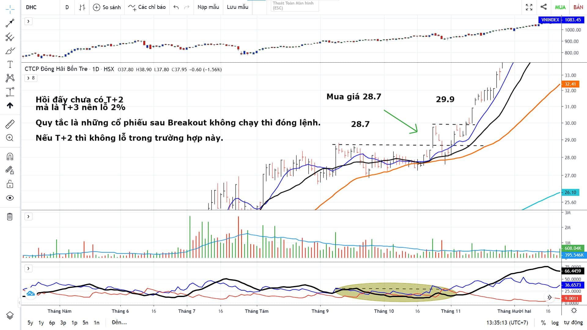 Tôi lấy ví dụ về cổ phiếu DHC bên dưới. Giả sử chúng ta mua vào điểm chuẩn vượt đỉnh 28.7 thì đáng ra T+3 thì hàng mới về do thực hiện vào năm 2021. Thì khi hàng về do tính chất thị trường lúc đó gặp áp lực giảm. Nên chúng ta có thể bị lỗ 1-2%. Theo quy tắc chuẩn của Dan Zanger: " Nếu cổ phiếu breakout với khối lượng thấp tôi sẽ xem xét bán hết và những con chiến mã sau khi breakout mà không chạy thì tôi cũng xem xét bán.".