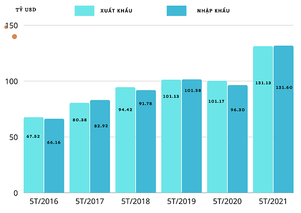 Trị giá xuất khẩu, nhập khẩu và cán cân thương mại của Việt Nam trong 5 tháng đầu năm, giai đoạn 2016-2021
