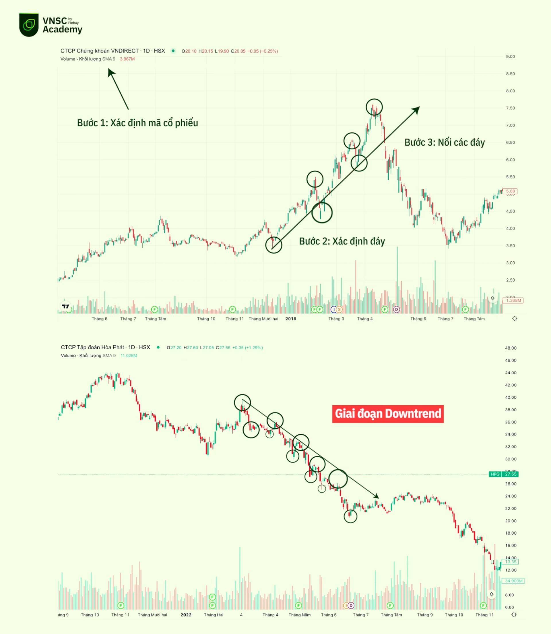 Bước 1: Xác định mã cổ phiếu muốn vẽ đường trendline đang trong xu hướng tăng hay giảm. Bạn hãy so sánh vị trí các đỉnh và đáy với nhau