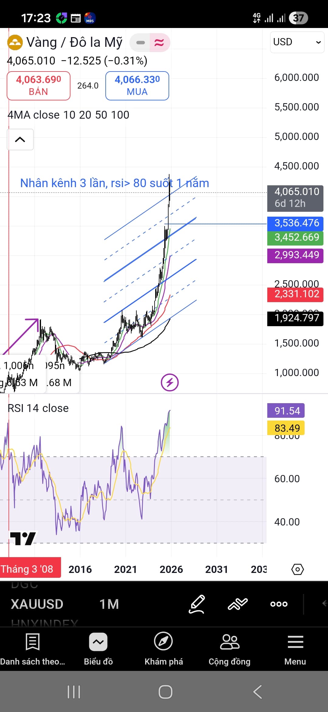 Gần đây ae vẽ tranh treo cái kêmh xu hướng nối đỉnh đáy 2018-2022 ra làm.cơ sở. Thực tế thì kênh xu hướng đầu tiên phải là xu hướng cho chu kì thị trường, 2018, 2022 thuộc về chu kì 2012-2022, nối lên cũng không nhiều ý nghĩa. Thứ 2, nếu giá phá kênh thì lúc đó ae lại phải chỉnh bằng nhân kênh hoặc chuyển kênh. Ngoài ra rsi cao thì 2 ý nghĩa, 1 là quá mua. 2 là mua quá mạnh. Gửi cho ae cái chart cậu vàng, nhân kênh 3 lần còn chưa đủ