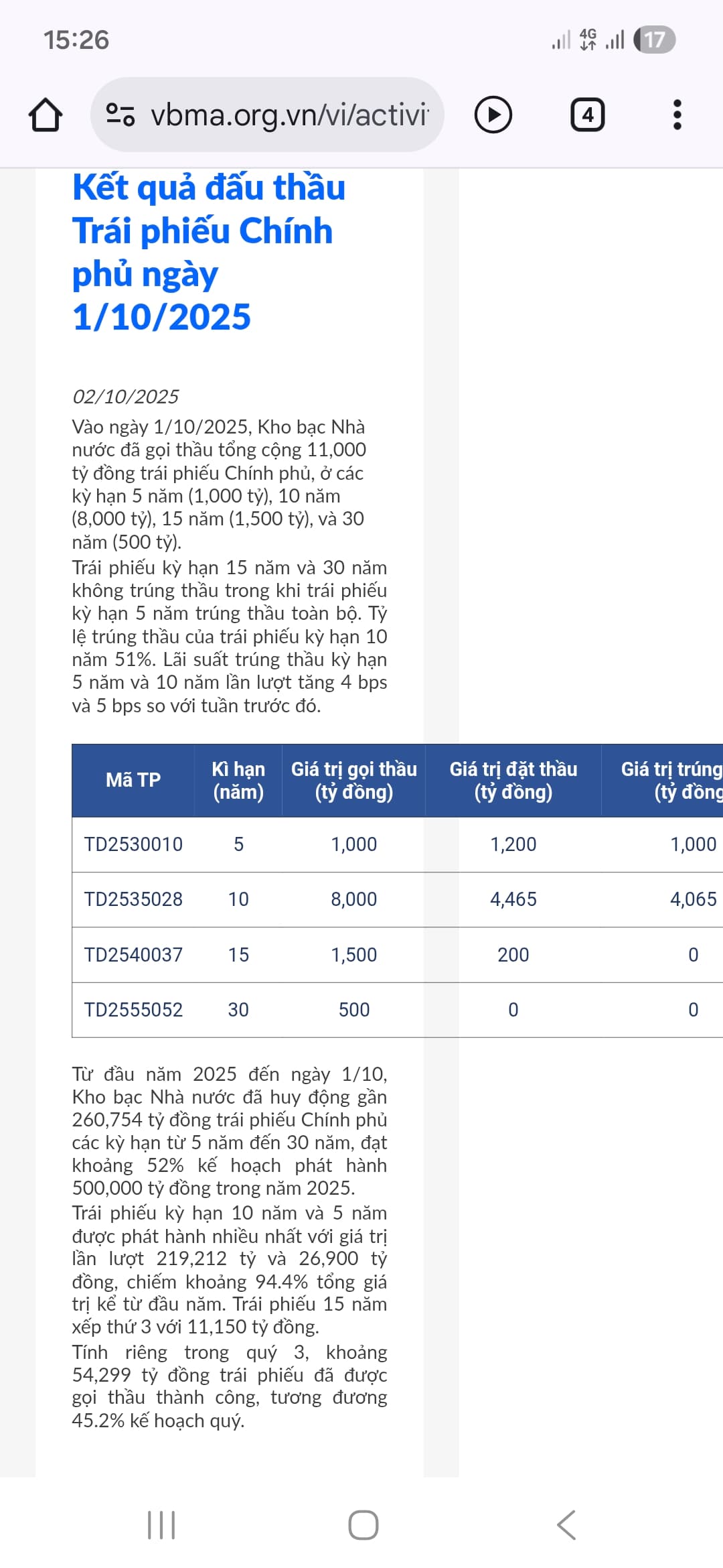 Nay 500 ae vác ls bond 30Y ra khè, sợ quá kiểm tra lại thì toàn bộ trái phiếu 15, 30 năm đều không trúng thầu. Hàm nghĩa ls tăng là rẻ hơn thì không ai mua. Vậy ae vác ls vn30y ra để khè ai