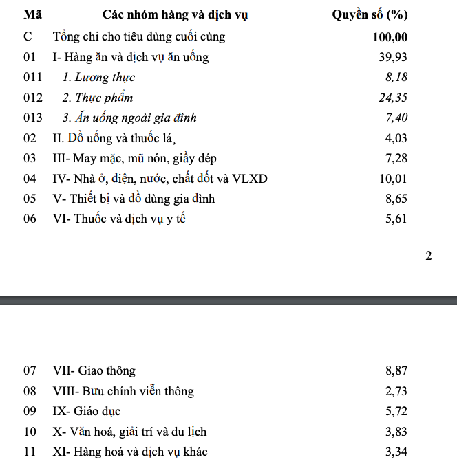 Mà dịch vụ ăn uống chiếm gần 40% trong rổ hàng hoá. Ăn uống cũng gián tiếp ảnh hưởng đến mấy món kia. Nhưng mà số 30% này là ước lượng thôi chứ chưa có thống kê chính xác.