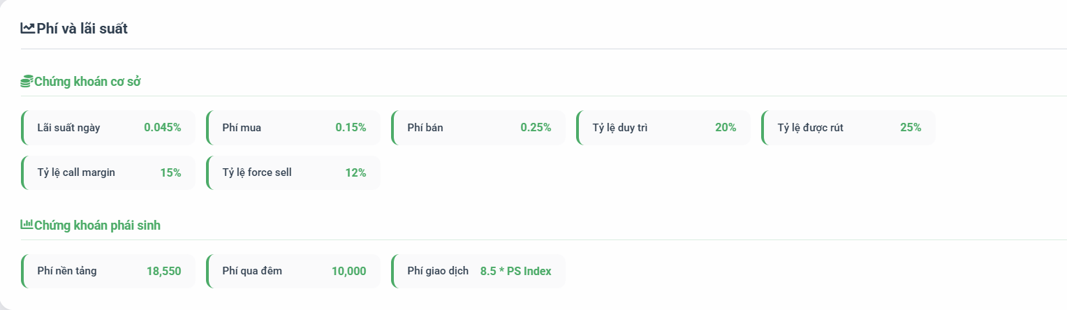 Với sân chơi Phái sinh, sức sát thương cũng được tối đa hóa khi tỷ lệ ký quỹ ban đầu chỉ yêu cầu 15% trên một hợp đồng, phí qua đêm vỏn vẹn 10.000đ/vị thế. Đây là bệ phóng hoàn hảo để xoay vòng vốn khối lượng lớn.