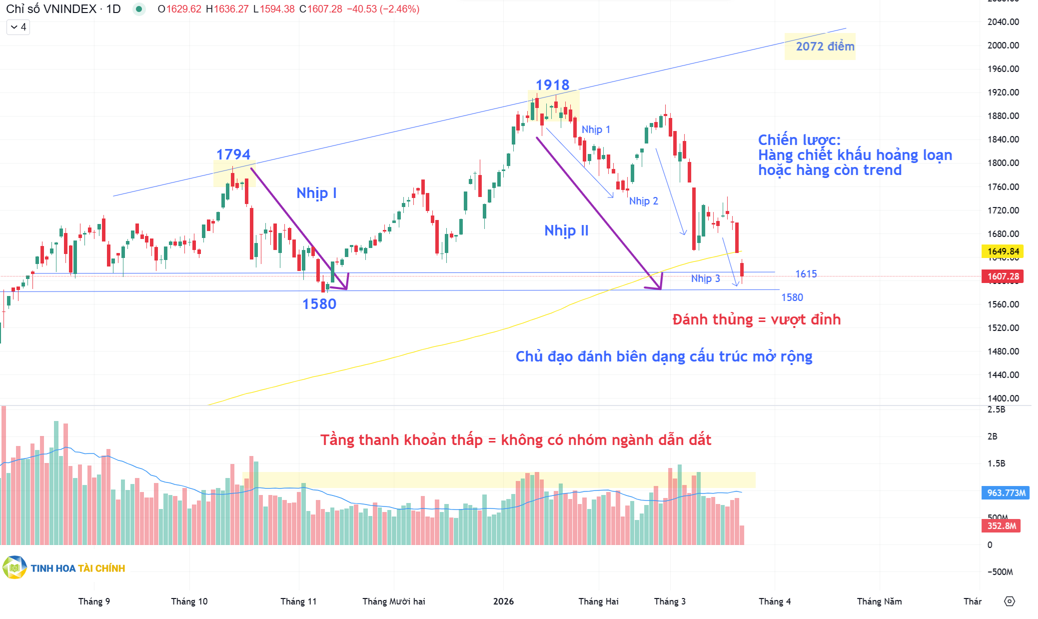 Dạng cấu trúc trên chỉ số VNIndex Huấn đang quan sát dạng cấu trúc mở rộng với thiên hướng đánh thủng để vượt đỉnh trước đó. Ở nhịp I lớn thị trường tạo đỉnh ở 1794 điểm và về lại 1580 điểm ở tháng 11.2025, nhịp II lớn kế tiếp nhịp hồi phục I lớn lên những vùng 1918 điểm hồi tháng 1.2026 và hiện tại việc thị trường về lại hoặc thủng nhẹ vùng 1580 điểm đang mở ra một tăng điểm để vượt đỉnh 1918 điểm là điều dễ xảy ra.