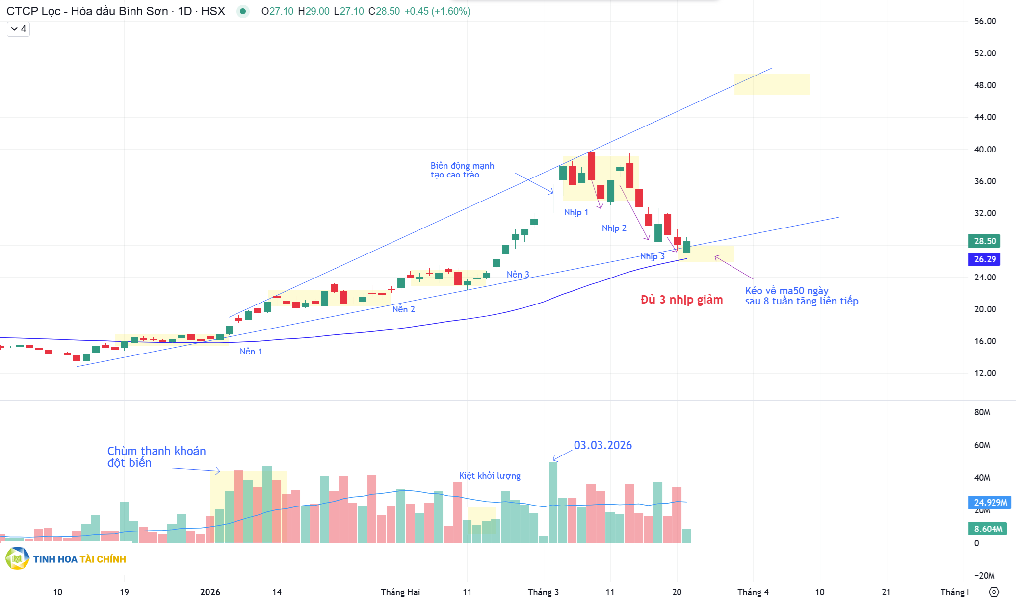 Cổ phiếu BSR đại diện cho việc thị trường có đáy nhịp này trong ngắn hạn, cấu trúc cổ phiếu đủ 3 nhịp giảm như chỉ số VNIndex. Như Huấn đã đề cập ở trên việc cổ phiếu tạo đáy ở đoạn này sẽ sớm hơn đáy của thị trường. Vì nhịp số 3 này cổ phiếu mạnh sẽ lên trước thị trường. Đồng thời ở nhóm ngành dầu khí thì BSR là cổ phiếu hiếm hoi còn giữ được xu hướng. Nhà đầu tư tự mình lọc ra những cổ phiếu còn xu hướng hoặc đảo chiều dự trên cách đểm 3 nhịp giảm.