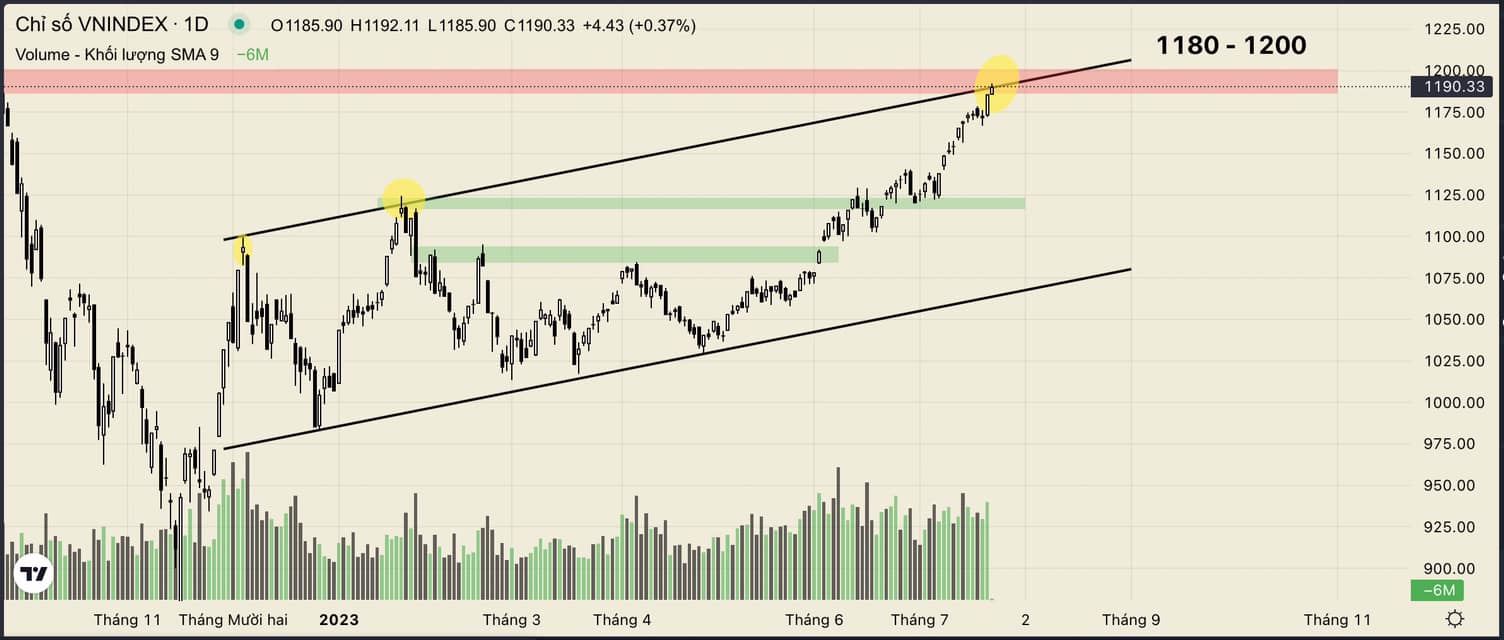 Về ngắn hạn, thị trường vẫn tiếp tục giữ được đà tăng mạnh mẽ và chinh phục thành công vùng 1180-1200 như dự kiến của Vũ từ quý 2/2023. Tuy nhiên việc giá tăng nóng trong giai đoạn rồi và hiện tại cũng đã tiệm cận vùng kháng cự mạnh 1180-1200, khả năng xảy ra rung lắc/điều chỉnh là hiện hữu. Do vậy anh chị em có thể tiếp tục nắm giữ danh mục hiện tại nhưng phải hết sức chú ý phần margin. Việc mua mới hiện tại cùng cần phải chú ý tránh FOMO.