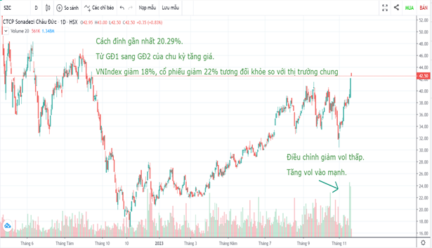 Sau khi tạo đáy ngày 16/11 cùng thị trường, SZC đã tích lũy đi ngang 4 tháng và thiết lập ngày phá vỡ với khối lượng tăng mạnh ngày 31/3, giúp cổ phiếu vào xu hướng tăng trung hạn tới nay.