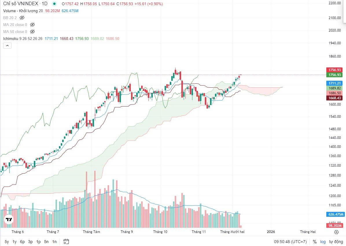 Theo ichimoku, VNIndex đã phá mây đi lên, đây là tín hiệu rất tích cực cho trung - dài hạn