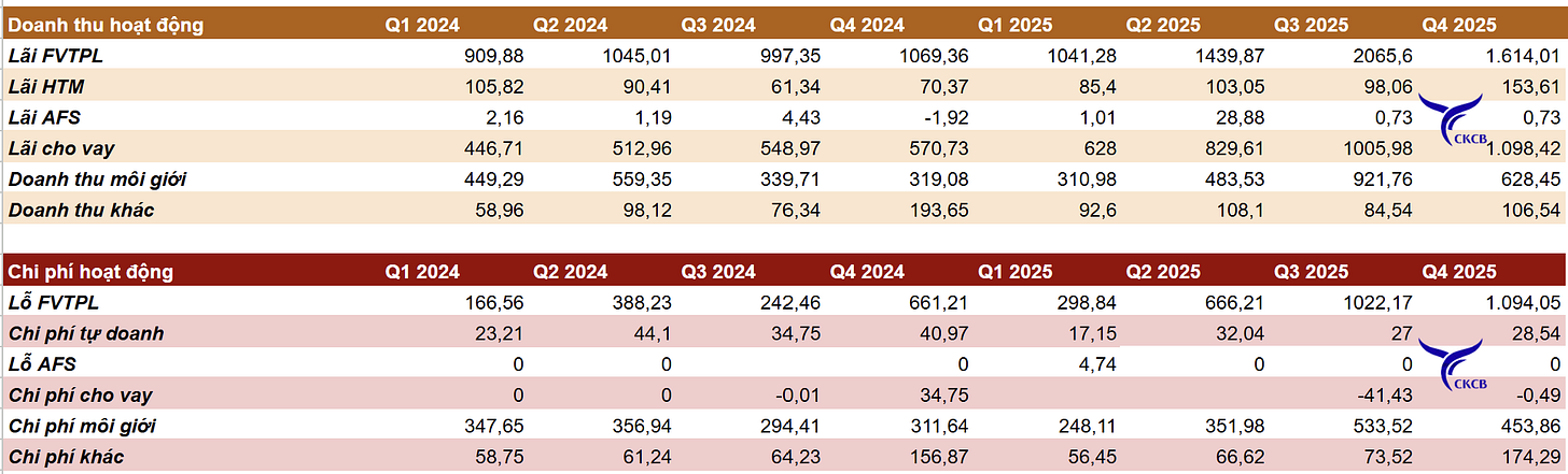 - Doanh thu môi giới quý 4/2025 tăng 97% so với cùng kỳ năm trước. Lợi nhuận từ mảng này đạt 176 tỷ đồng,
