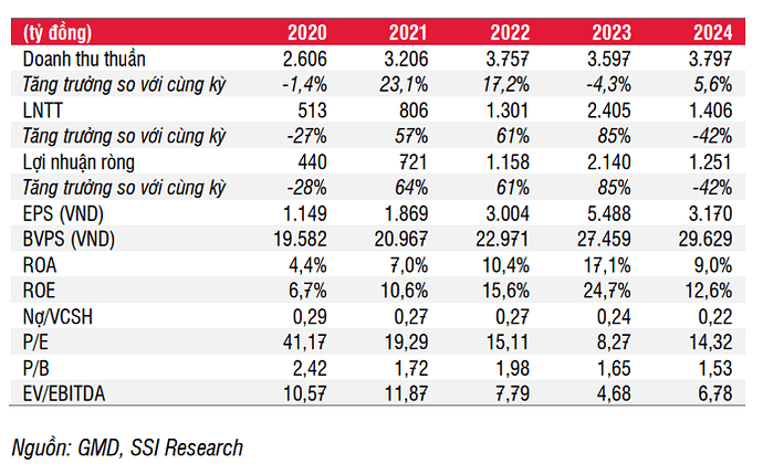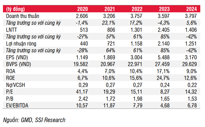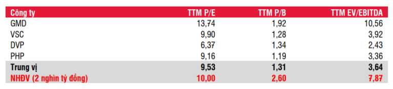 Trong kịch bản cơ sở, với ước tính LNST cả năm của NHĐV đạt khoảng 200 tỷ đồng và sử dụng P/E mục tiêu là 10 lần, chúng tôi kỳ vọng giá trị giao dịch có thể xấp xỉ 2 nghìn tỷ đồng, tương đương mức P/B là 2,6 lần và EV/EBITDA là 7,87 lần, cao hơn so với các công ty cùng ngành. Như vậy, GMD có thể ghi nhận khoản lợi nhuận 1,2 nghìn tỷ đồng trong năm 2023.