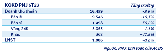 PNJ công bố doanh thu thuần và LNST lần lượt đạt 6.663 tỷ đồng (-17,4% n/n) và 338 tỷ đồng (-8,0% n/n) trong Q2/23. Lũy kế 6T23, doanh thu thuần và LNST của công ty lần lượt giảm 9,6% và 0,2% n/n, đạt 16.459 tỷ đồng và 1.086 tỷ đồng.