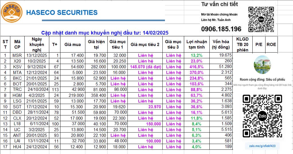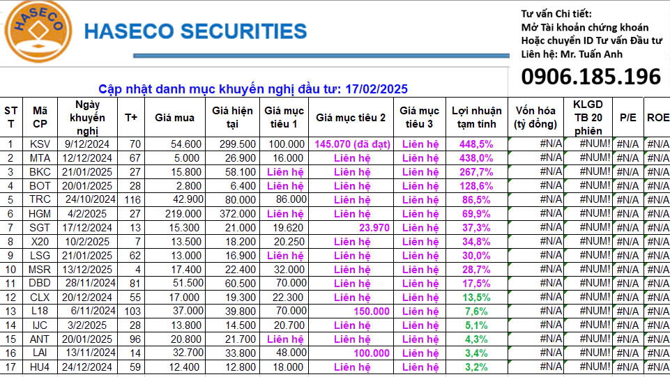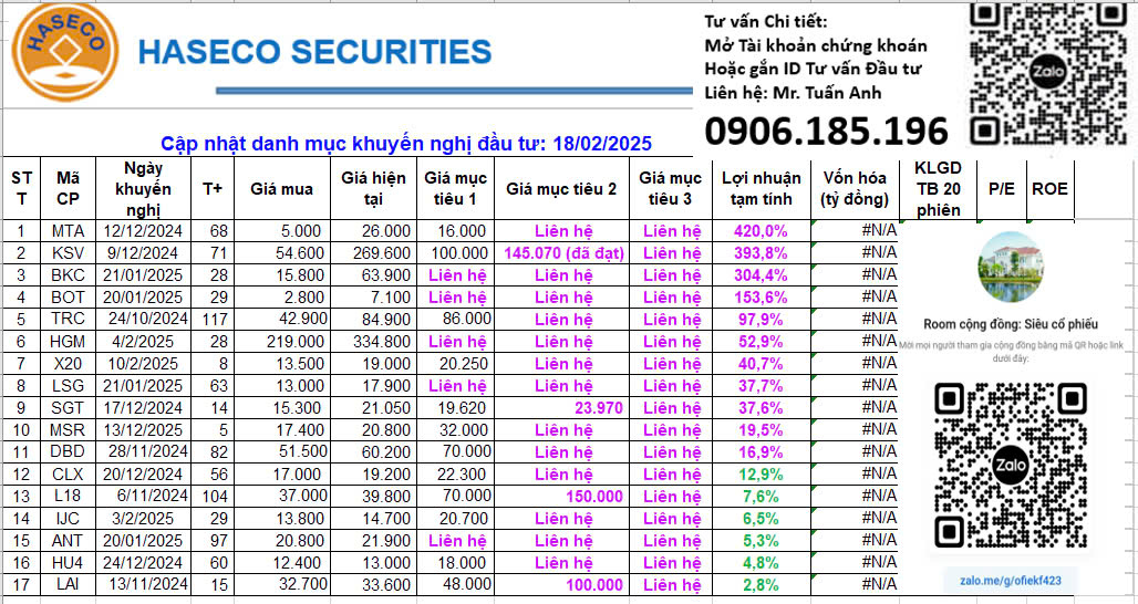 Em gửi Anh/Chị cập nhật danh mục cuối ngày 18.02.2025: