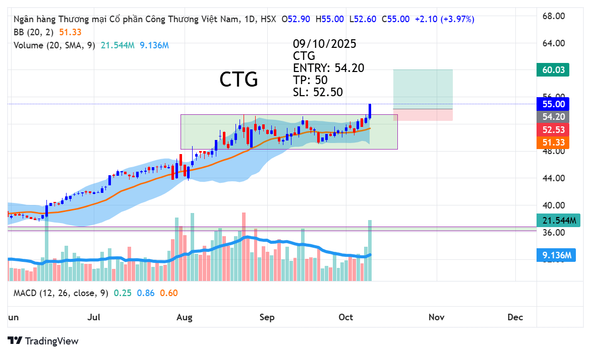 Ngày 9 tháng 10, CTG đã vượt đỉnh lịch sử và thoát khỏi vùng tích lũy. CTG tăng 4% với thanh khoản gấp đôi trung bình 20 phiên, cho thấy dòng tiền đang vào mạnh. Đây là một trong những cổ phiếu vượt vùng tích lũy trước thị trường. Mô hình tích lũy của CTG cũng rất đẹp khi biên độ hẹp, dải Bollinger Band được bóp lại và phiên hôm nay đã break lên trên, tạo điểm mua.