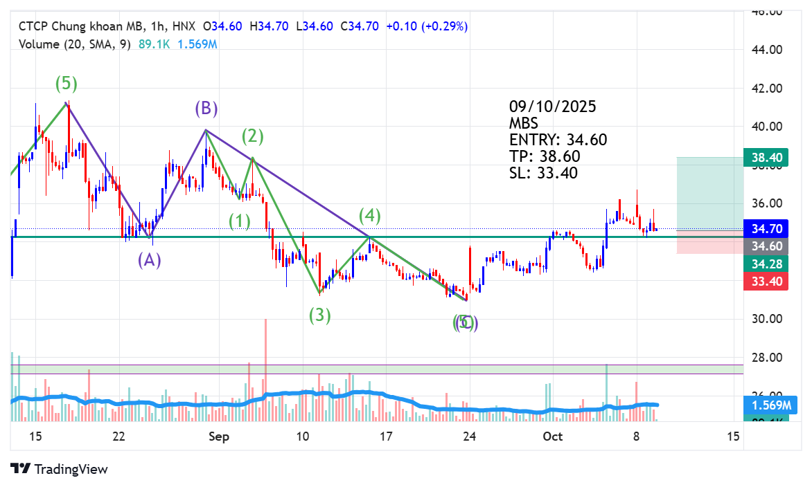 Sau khi MBS hoàn thành 5 sóng tăng Elliott, cổ phiếu đã bước vào sóng điều chỉnh ABC. Hiện tại, MBS cũng đã hoàn thành sóng chỉnh này. Trong sóng C có 5 sóng nhỏ, và khi giá vượt lên khỏi đỉnh sóng 4 trong sóng C thì đó là tín hiệu mua. Vào ngày 6 tháng 10, giá đã vượt qua sóng 4 trong sóng C, tạo ra điểm mua với thanh khoản tăng mạnh, gấp đôi trung bình 20 phiên, và giá vẫn đóng cửa trên vùng sóng 4. Hiện tại, giá đang retest lại điểm break, mở ra cơ hội mua mới.