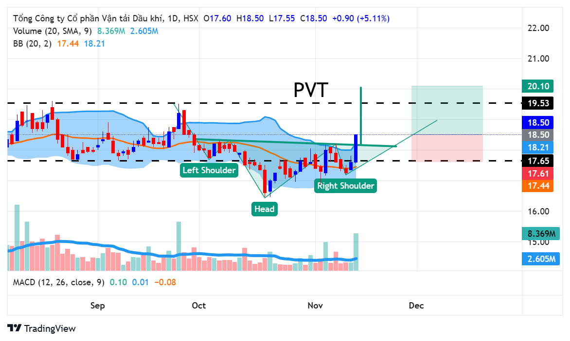 Hôm nay PVT đã vượt qua đường cổ với thanh khoản lớn, xác nhận điểm breakout và hoàn thành mẫu hình vai đầu vai (VĐV) ngược. Với tín hiệu kỹ thuật này, điểm mua hợp lý sẽ nằm ở vùng break hoặc cao hơn vài phần trăm để đảm bảo xu hướng được xác nhận. Theo mẫu hình VĐV ngược, giá mục tiêu của PVT sẽ hướng đến vùng 20.10, trong khi điểm cắt lỗ nên đặt tại đường MA20 để giới hạn rủi ro nếu xu hướng tăng không được duy trì.