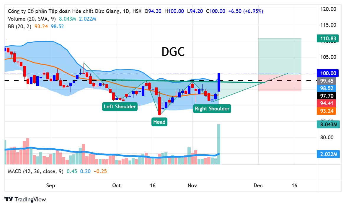 Hôm nay DGC đã hoàn thành mẫu hình VĐV ngược khá sớm ngay trong phiên sáng, khi giá tăng trần chỉ sau 1 tiếng mở cửa thị trường. Cổ phiếu break mạnh và đóng cửa trên đường cổ với thanh khoản lớn, xác nhận tín hiệu bứt phá. Với mẫu hình VĐV ngược, giá mục tiêu của DGC được xác định ở vùng 110, trong khi điểm cắt lỗ nên đặt tại MA20 để đảm bảo an toàn cho vị thế.