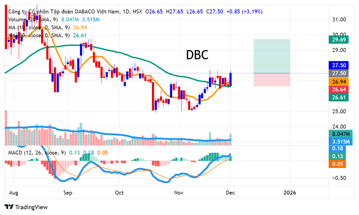 Nhìn vào DBC thì hôm nay chúng ta thấy xuất hiện một điểm pocket pivot khi biên độ tăng đạt 3.20%, MA10 nằm trên MA50 và hai đường MA nằm khá gần nhau, thanh khoản cao hơn các phiên bị bán trong 10 phiên gần nhất và trước đó có một nền giá nhỏ khoảng 2 tuần. Khi tất cả các điều kiện được đáp ứng, DBC đã mở ra điểm mua với giá 27.50, điểm cắt lỗ ở 26.65 và giá mục tiêu là 29.70.