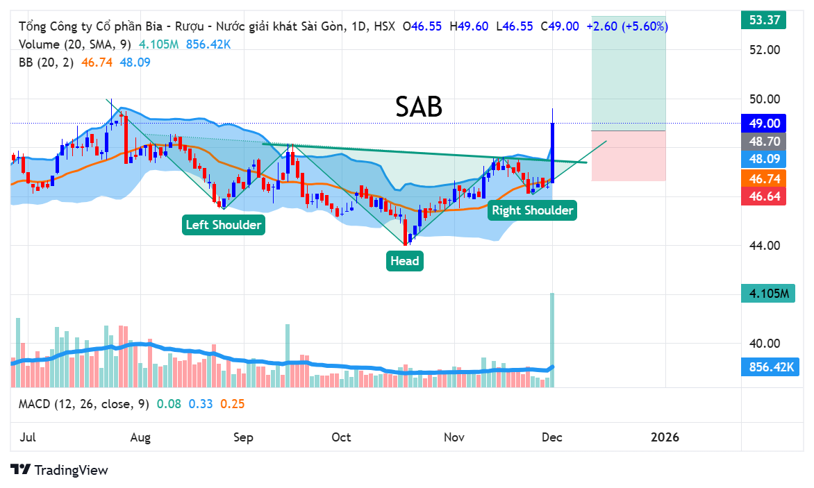 Hôm nay SAB hoàn thành mẫu hình VĐV khi giá chính thức break đường cổ quanh 47 và tạo ra điểm mua ngay từ phiên sáng nhờ thanh khoản vào rất mạnh; với cú break này, chúng ta có thể mở mua SAB tại 48.70, đặt cắt lỗ ở vùng MA20 và hướng đến mục tiêu giá 53.40.