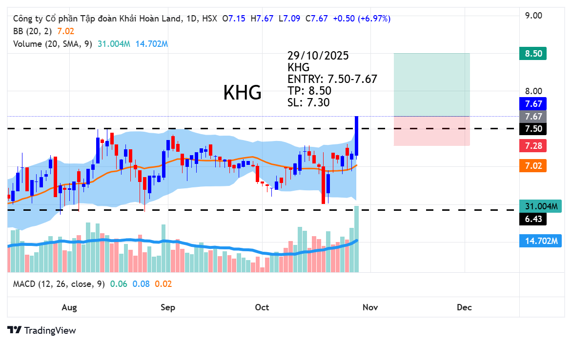 Khuyến nghị mua KHG ở giá 7.67, giá mục tiêu 8.50 (Upsize 11%), giá cắt lỗ 7.30 (-5%).