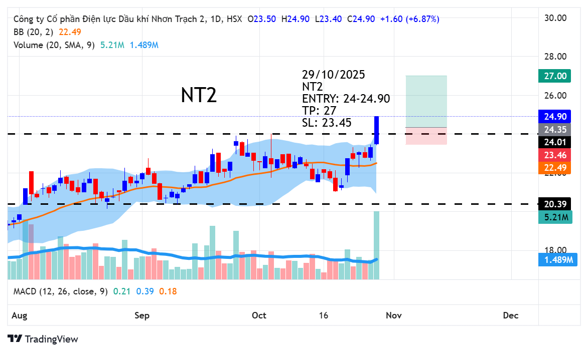 Khuyến nghị mua NT2 ở giá 24–24.90, giá mục tiêu 27 (Upsize 11%), giá cắt lỗ 23.45 (-3.70%).