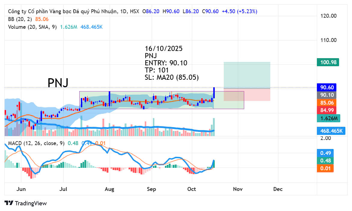 Khuyến nghị: Mua PNJ tại vùng giá 89–92.10, giá mục tiêu 106 (Upside ~15.4%), cắt lỗ tại MA20, hiện ở 85.10 (-7%).