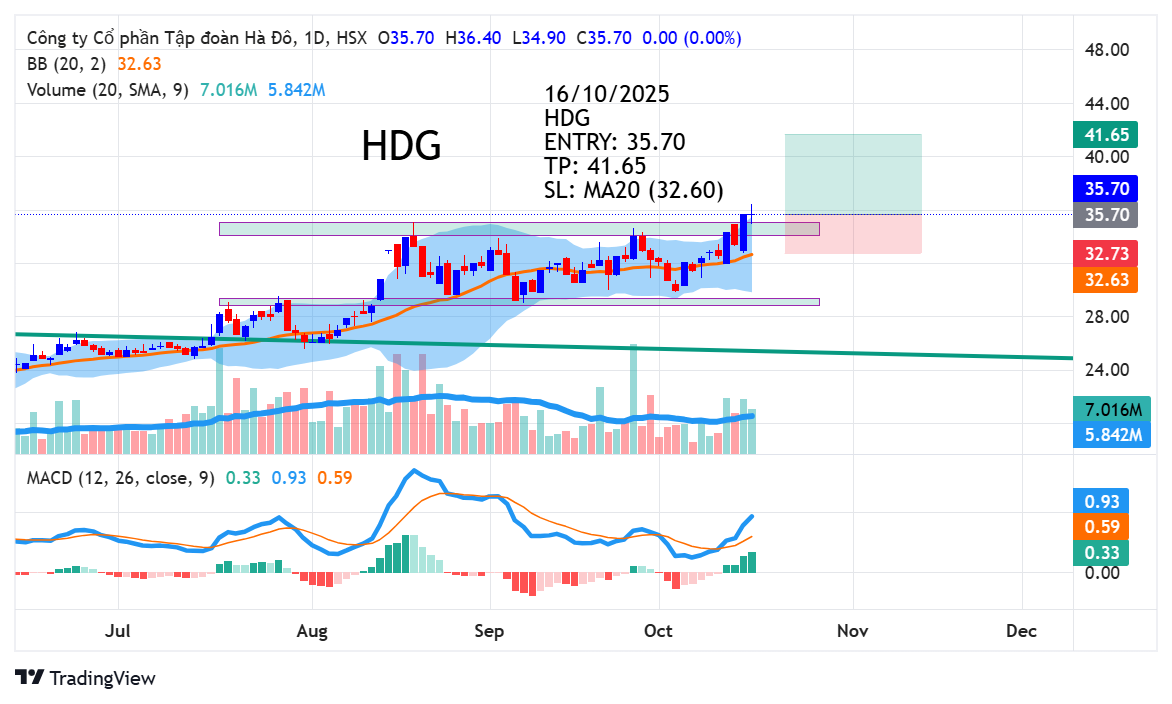 Khuyến nghị: Mua HDG tại vùng giá 35.70, giá mục tiêu 41.65 (Upside ~16.5%), cắt lỗ tại MA20, hiện ở 32.60 (-8%).