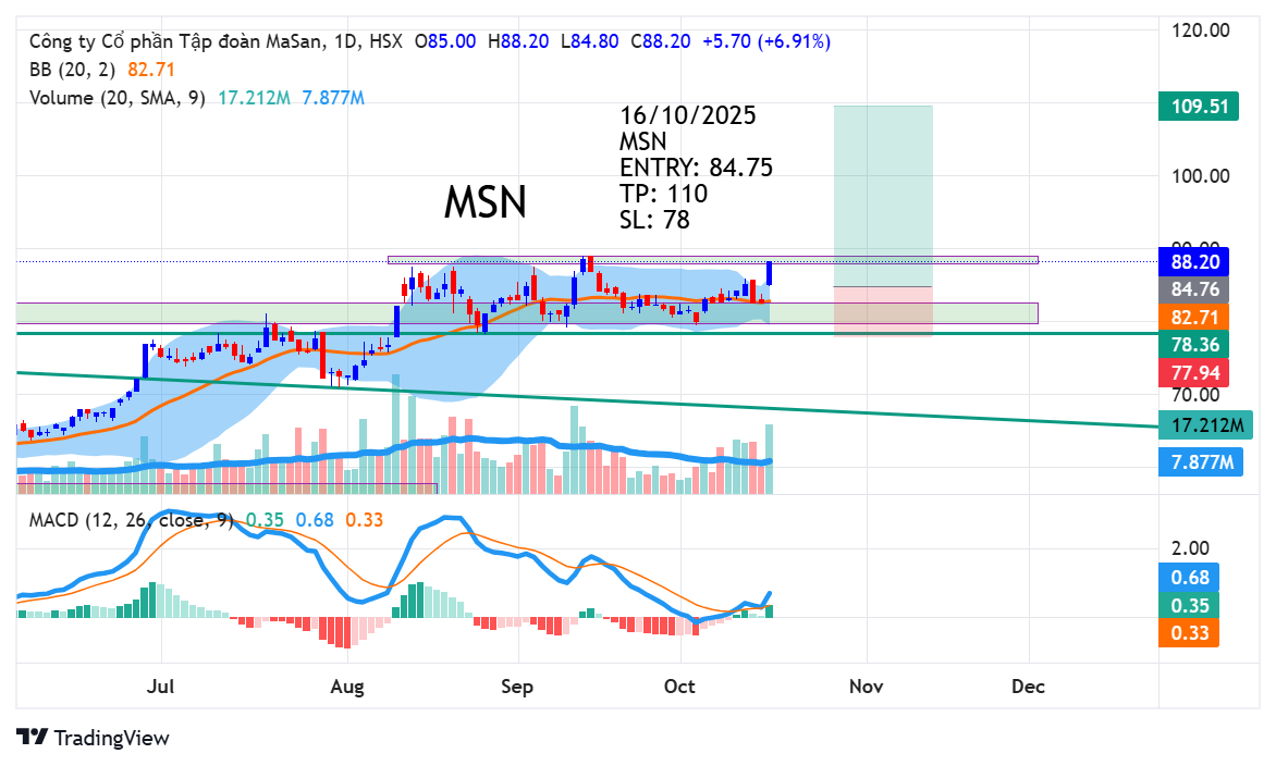 Khuyến nghị: Mua MSN tại vùng giá 88.20, giá mục tiêu 110 (Upside ~25%), cắt lỗ tại 78.40 (-8%).