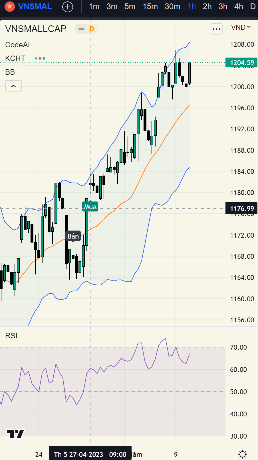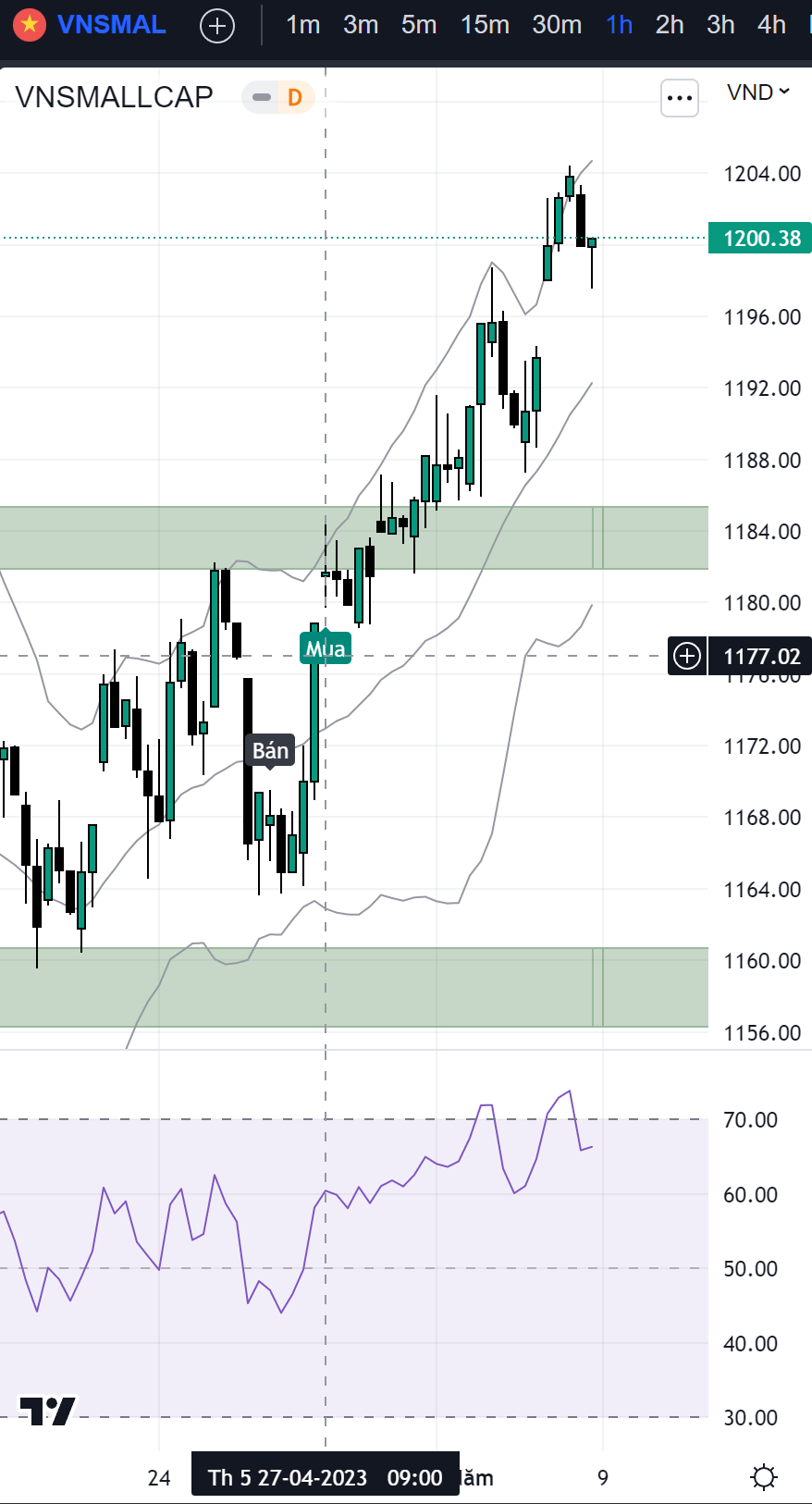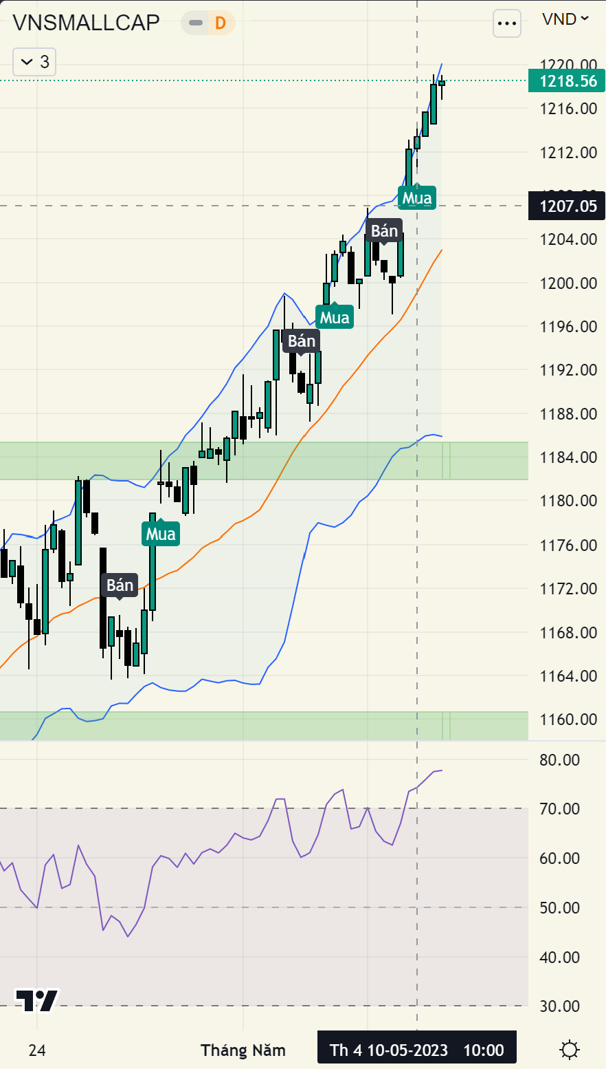VNSMALLCAP: nhóm penny thời gian qua vẫn thể hiện sức mạnh rõ nét nhất khi liên tục xuất hiện tín hiệu bán giả, Bollinger Bands thu hẹp theo chiều tăng thể hiện xu hướng tăng nhất quán. Tuy nhiên ae cần lưu ý, theo kinh nghiệm của mình khi BB có xu hướng phình to ra như hiện tại thì khả năng cao nhóm penny cũng đang vào đoạn tăng nước rút của nó, nói cách khác penny đang chuẩn bị chững lại dần, khoảng chững này có thể là tích lũy để tiếp tục tăng, hoặc cũng có thể là phân phối.