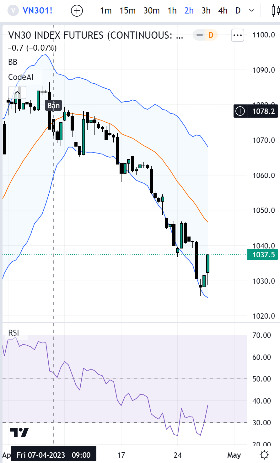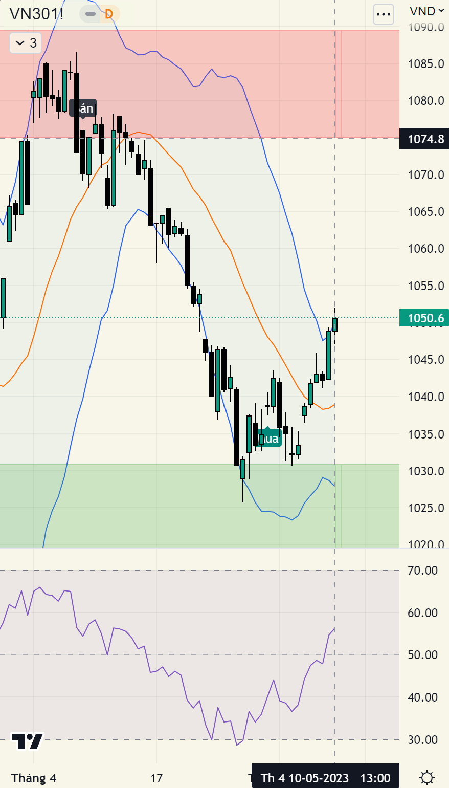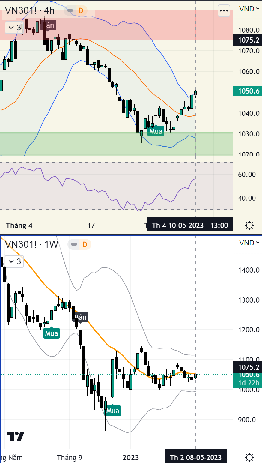 VN30F1M: tương tự vnindex & vn30, phái sinh cũng chưa có tín hiệu mới, xét tổng quan ở khung H4 thì 1075 là kháng cự tiếp theo, mình sẽ cập nhật vì chắc chắn trong quãng đường lên 1075 nó sẽ xuất hiện kháng cự mới. Các ngưỡng kháng cự hỗ trợ này dựa trên các điểm xoay pivot.