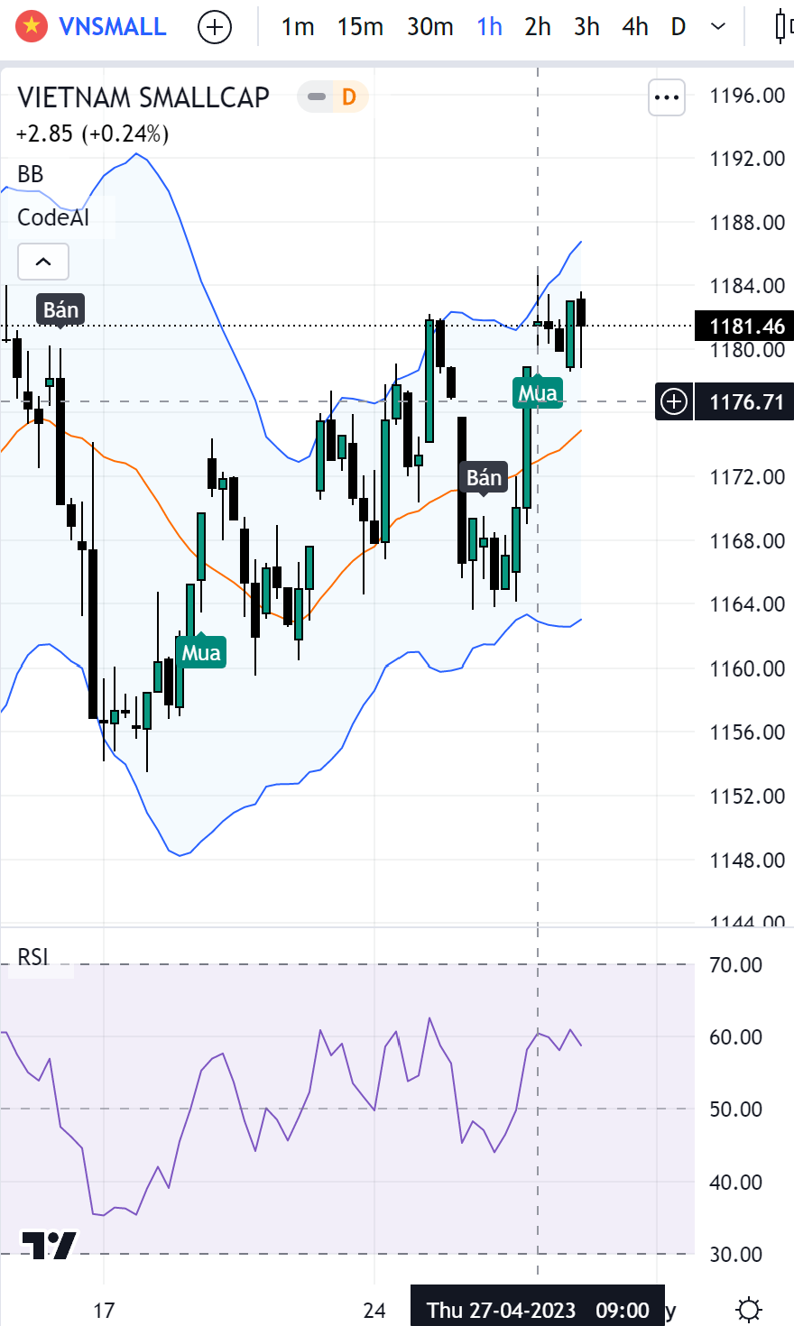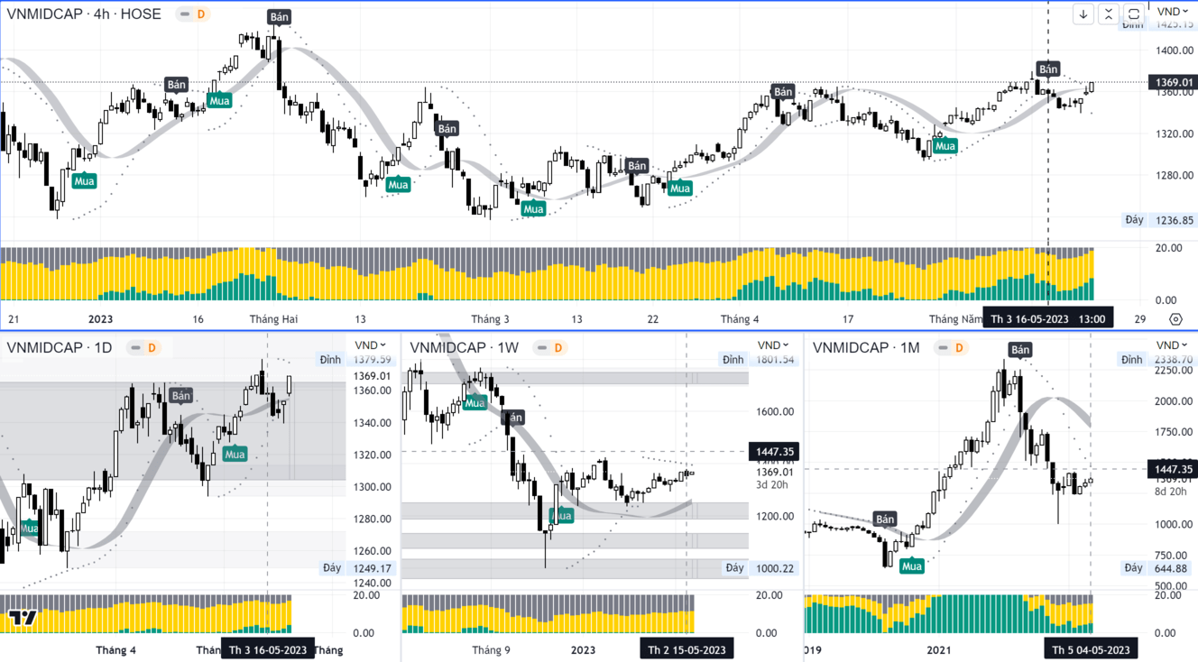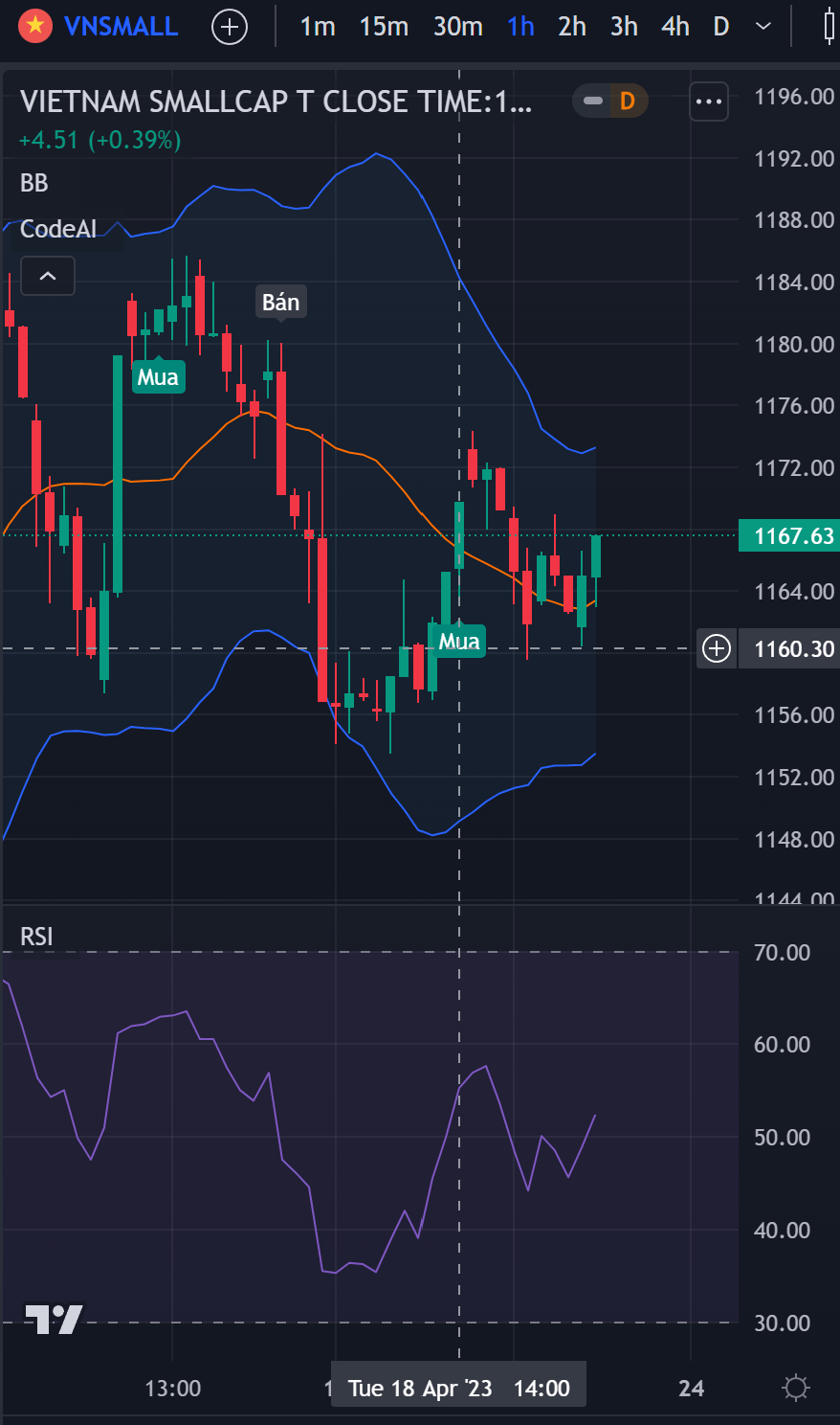 Tương tự hôm qua, chưa có tín hiệu Mua uy tín ở các chỉ số kể từ sau tín hiệu Bán ngày 14/4/2023. VNSMALLCAP chỉ báo mua ở khung H1 hôm 18 chưa nhảy lên khung H2.