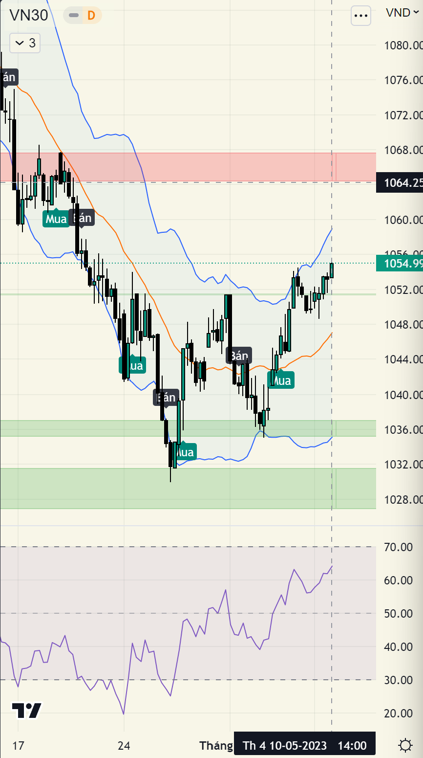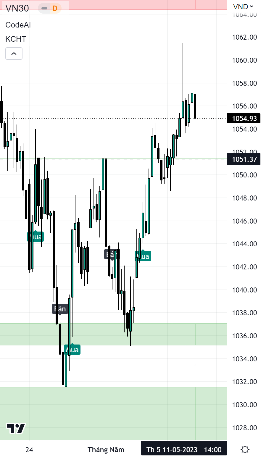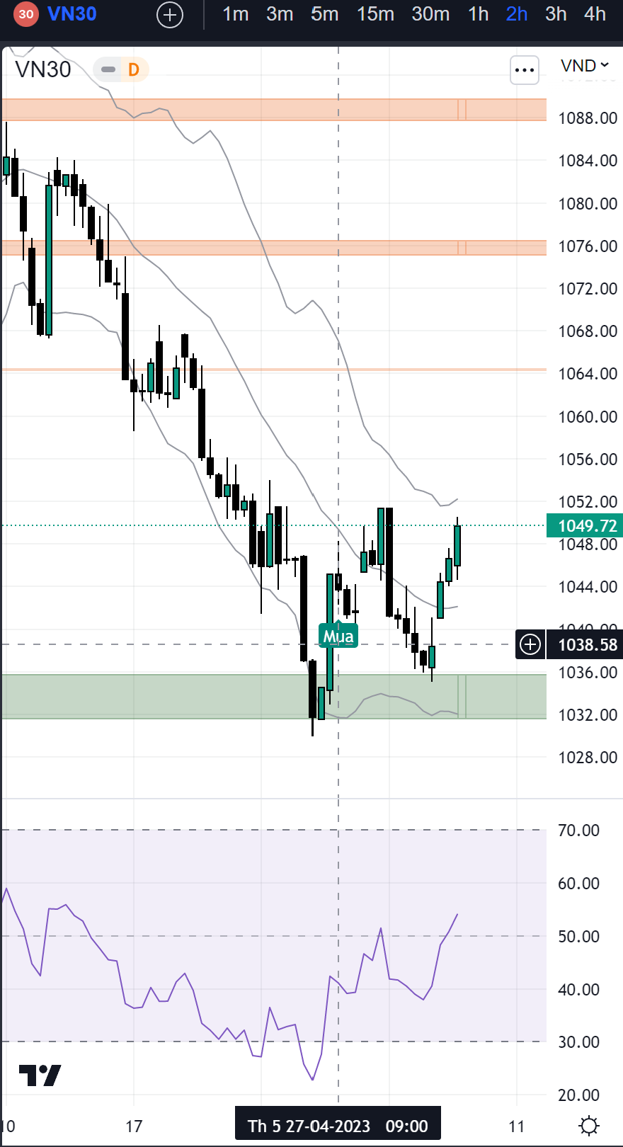 Như đã đề cập hôm qua, mốc kháng cự tại H1 ở 1056 đã khiến các chỉ số giảm điểm, tuy nhiên lực mua hấp thụ cuối phiên vẫn duy trì. Đây cũng là ngưỡng kháng cự mỏng do đó khả năng sẽ vượt thành công. Trong tuần này dự kiến có tin hạ lãi suất huy động từ các bank lớn đóng góp thêm động lực. Về tín hiệu mua bán chưa có tín hiệu mới.