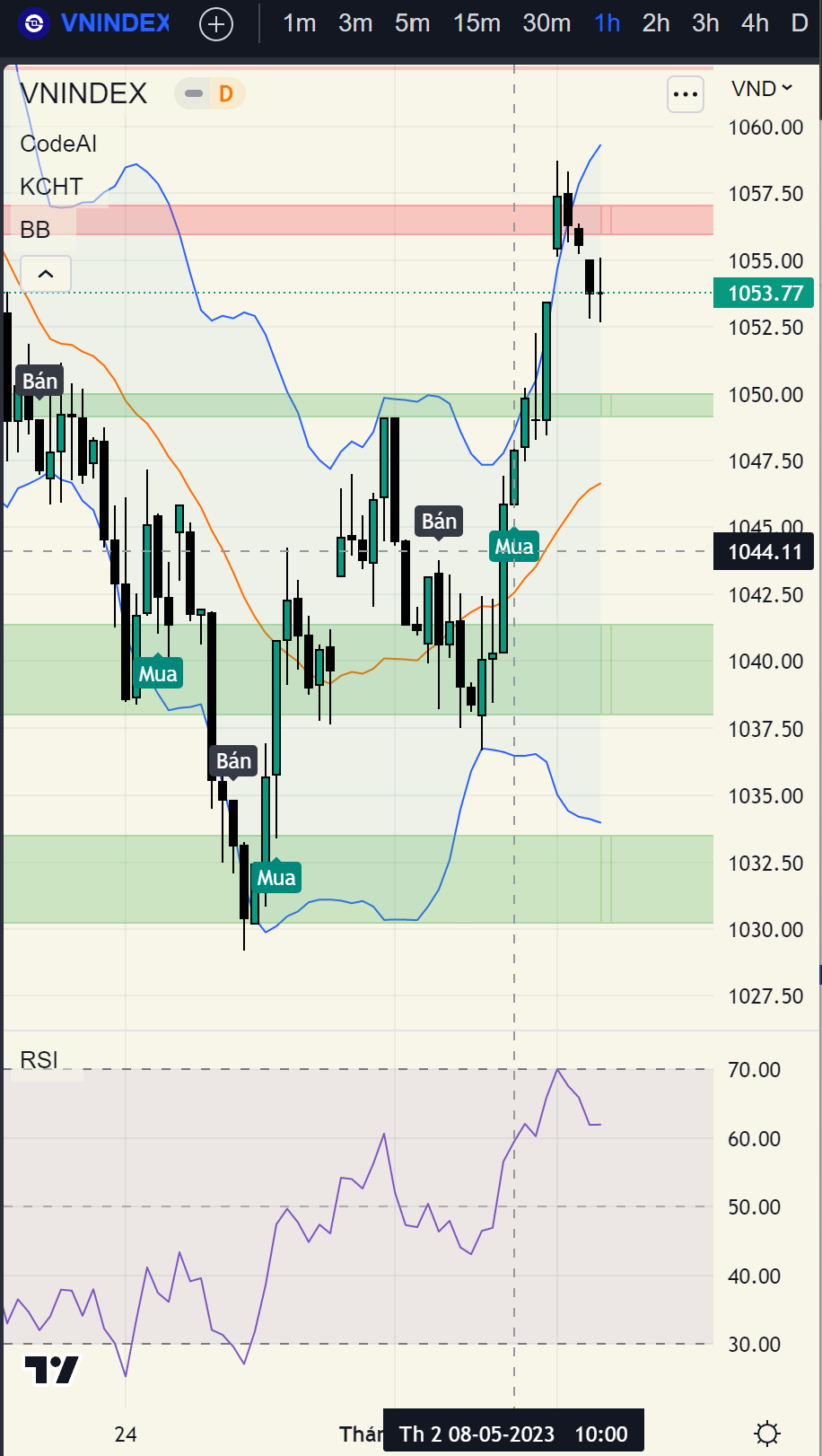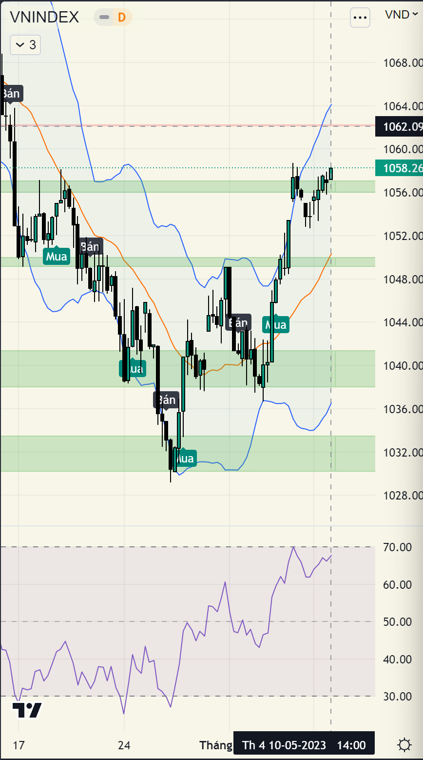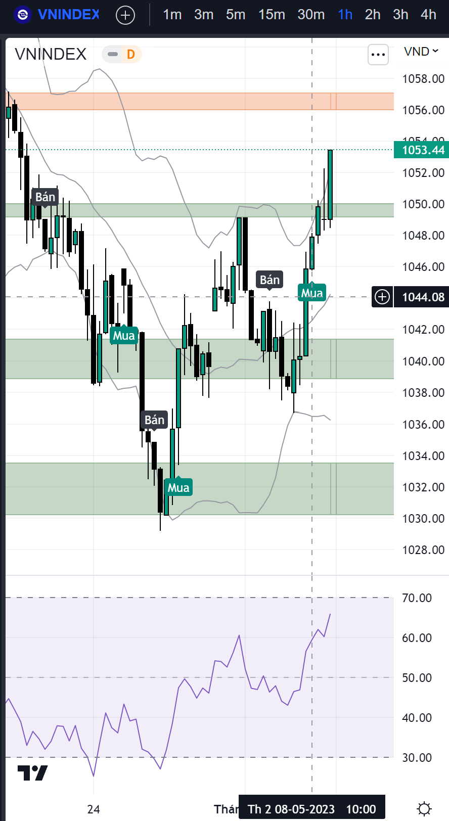 Như đã đề cập hôm qua, mốc kháng cự tại H1 ở 1056 đã khiến các chỉ số giảm điểm, tuy nhiên lực mua hấp thụ cuối phiên vẫn duy trì. Đây cũng là ngưỡng kháng cự mỏng do đó khả năng sẽ vượt thành công. Trong tuần này dự kiến có tin hạ lãi suất huy động từ các bank lớn đóng góp thêm động lực. Về tín hiệu mua bán chưa có tín hiệu mới.