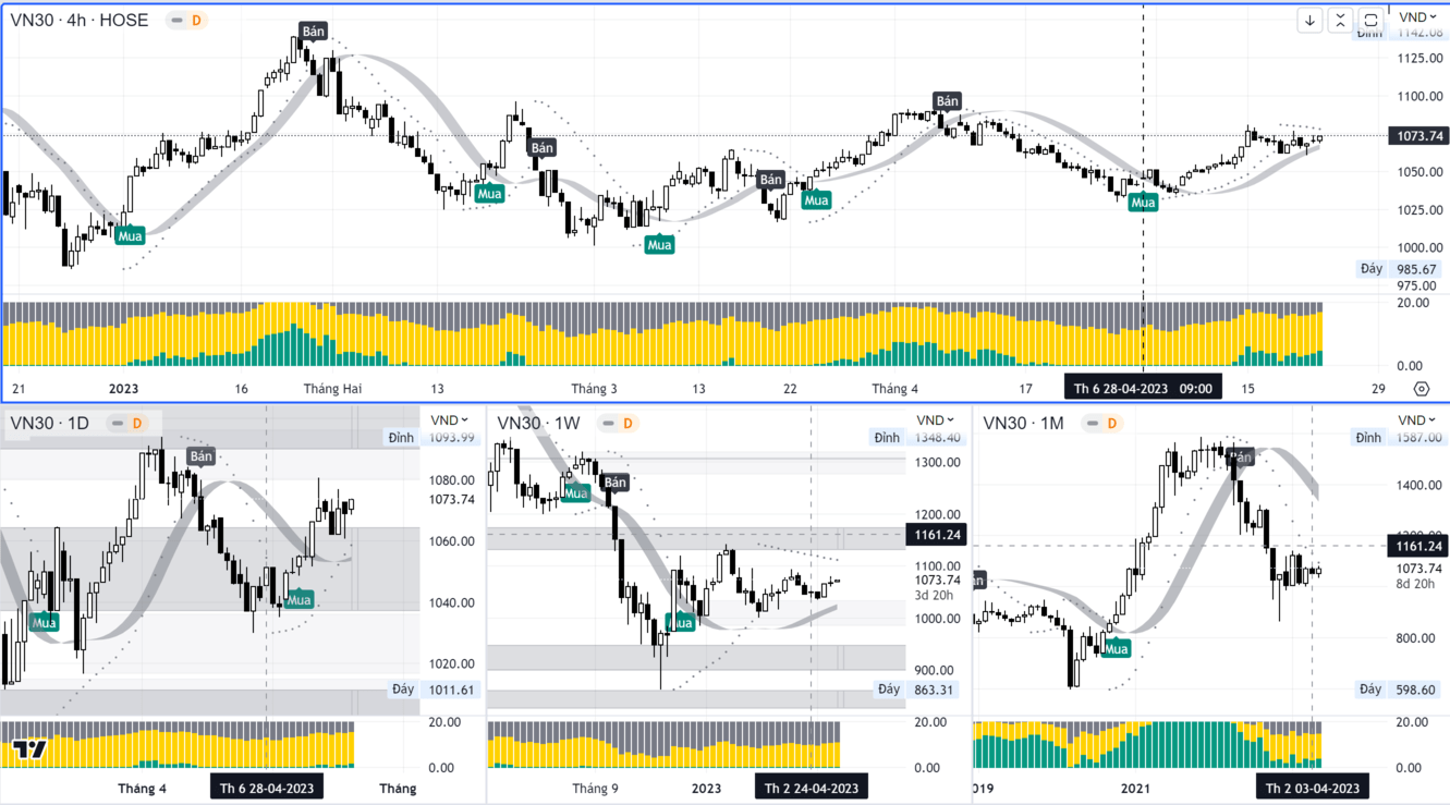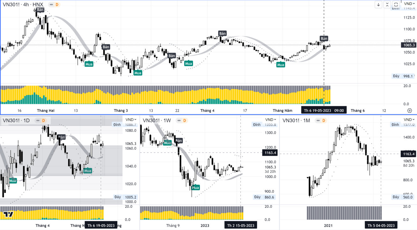 VNINDEX, VN30 & Phái sinh: tín hiệu mua H1 hôm qua đã nhảy sang khung H2 hôm nay, các khung lớn hơn chưa có. Thường thì sau đoạn giảm mạnh thì tín hiệu đầu tiên xuất hiện chưa chắc đã chính xác, có nghĩa là tín hiệu mua này cần nhảy sang cả H3, H4 mới có thể tin tưởng. Nếu không sẽ là tín hiệu Bán tiếp theo vào đầu tháng 5.