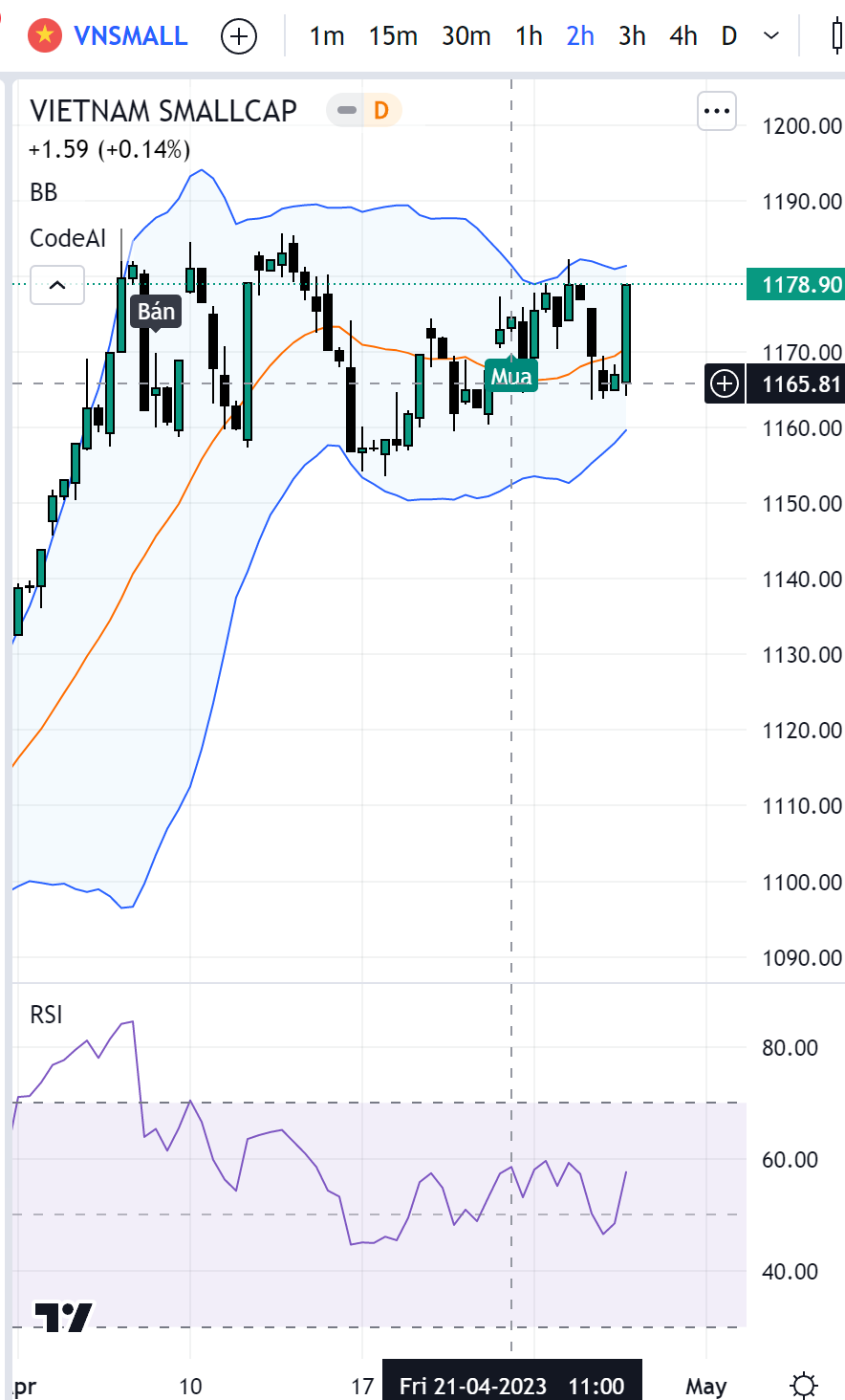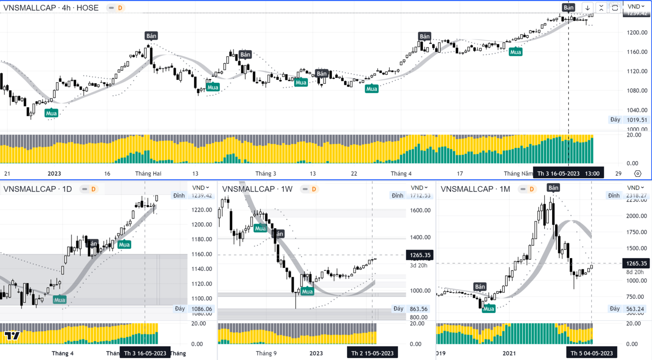 Tương tự các phiên trước, chưa có tín hiệu Mua uy tín ở các chỉ số kể từ sau tín hiệu Bán ngày 14/4/2023. Điều thú vị là VNSMALLCAP chỉ báo mua ở khung H1 hôm 18 ĐÃ nhảy lên khung H2.