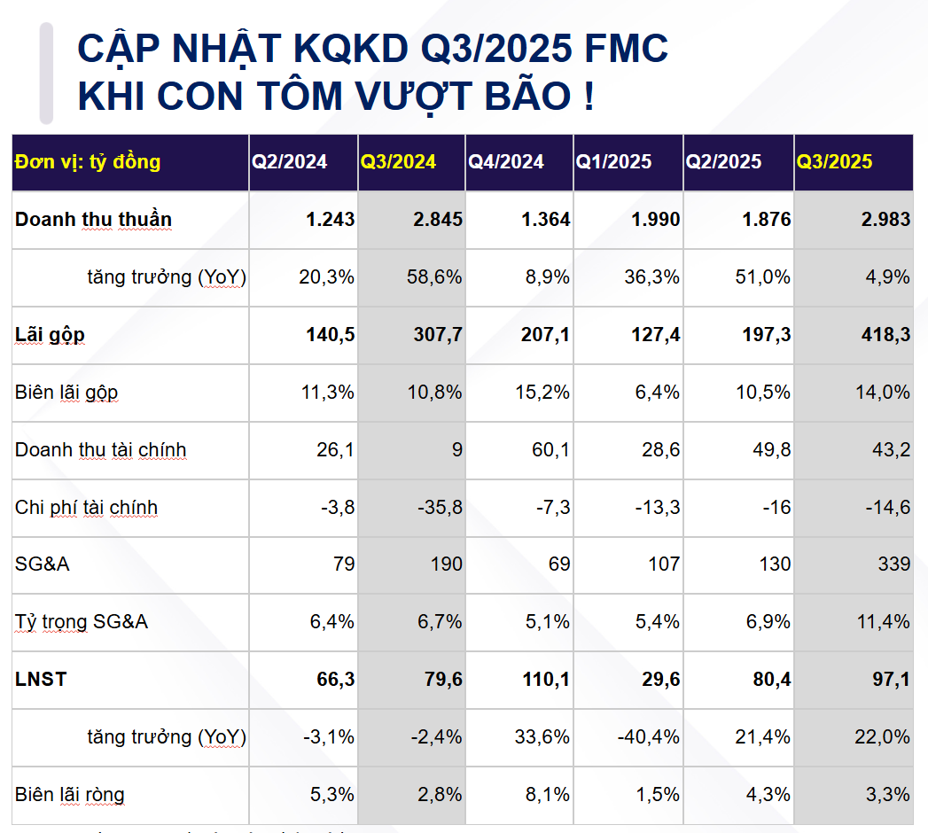 Lợi nhuận sau thuế và doanh thu của FMC Q3/2025 lần lượt đạt 97 tỷ tăng 22.0% và 2.983 tỷ tăng 4.9% YoY. Nhìn chung KQKD đang đi đúng so với dự phóng của Growth Investor đưa ra hồi đầu năm, và trong quý này chúng tôi thấy FMC có các điểm các chú ý sau: