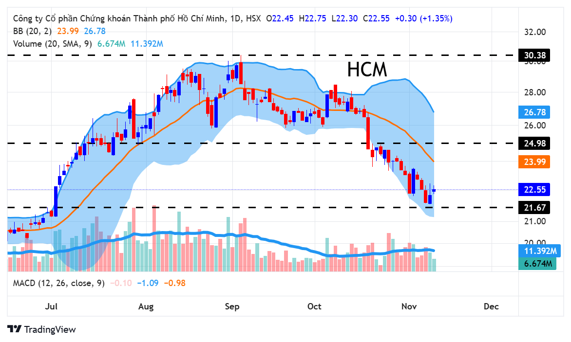 Biểu đồ của HCM gần như giống hệt với VCI khi cả hai cổ phiếu có diễn biến giá tương đồng. Khả năng cao kịch bản của HCM cũng sẽ tương tự như VCI và SSI — tức là đã giảm trước thị trường chung. Do đó, ngay cả khi thị trường tiếp tục giảm thêm, khả năng HCM giảm mạnh và thủng vùng giá 20 là rất thấp.