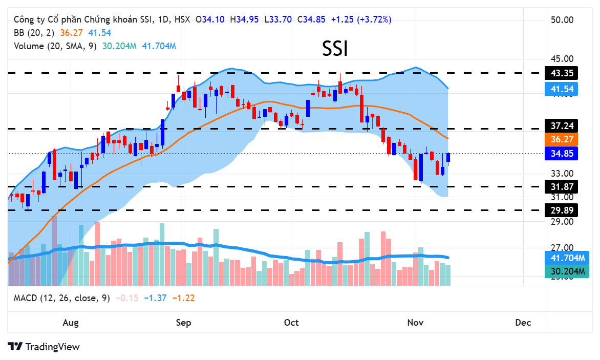 SSI đã thủng nền giá vào ngày 24 tháng 10 và sau đó tiếp tục đà giảm. Vào thời điểm đó, thị trường vẫn đang giao dịch quanh vùng 1700 và chưa thủng nền giá như SSI. Điều này cho thấy SSI đã giảm trước thị trường. Khi VNINDEX thủng 1600, SSI gần như không giảm thêm mà chỉ đi ngang quanh vùng giá mục tiêu giảm của mẫu hình hai đỉnh. SSI đang chạy trước thị trường, nên khả năng cao cổ phiếu này sẽ tạo nền giá và bật tăng trở lại trước khi thị trường chung hồi phục. Trong khi thị trường mới chỉ thủng 1600 và vẫn còn nhiều dư địa để giảm, thì SSI gần như đã hoàn thành mục tiêu giảm và không còn nhiều dư địa giảm tiếp.