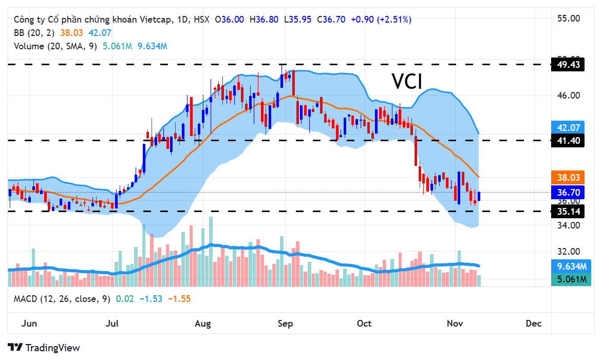 VCI đã thủng nền giá vào ngày 20 tháng 10, thậm chí còn sớm hơn cả SSI. Sau khi thủng nền, VCI giảm rất mạnh và nhanh, hiện tại đang tích lũy lại quanh vùng nền giá được hình thành từ tháng 7. Khả năng cao kịch bản của VCI sẽ tương tự SSI — tức là cổ phiếu đã giảm trước thị trường, và do đó có thể sẽ tạo nền ổn định và bật tăng trở lại sớm hơn so với thị trường chung.