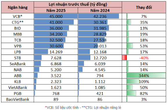 Trong đó, đã có 15 ngân hàng công bố kết quả kinh doanh năm 2025 là Vietcombank, VietinBank, BIDV, MB, Techcombank, VPBank, LPBank, Sacombank, Nam A Bank, Kienlongbank, ABBank, PGBank, BAOVIET Bank, VietABank và SeABank