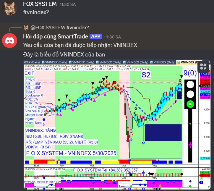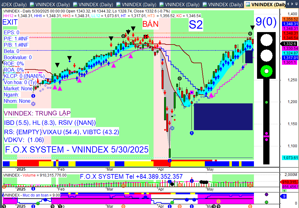 Phương pháp của tôi không đoán thị trường bạn à. PP chỉ đánh giá trạng thái và nhận biết các dấu hiệu để ra quyết định. Tinh thần là Thuận tự nhiên bạn nhé. Bạn có thể tham khảo toàn bộ nội dung phương pháp ở đầu pic này để cảm nhận tinh thần đó. hiện tại vẫn đèn xanh, mức an toàn 9 thì vẫn an toàn. Xuất hiện tam giác đen gợi ý có thể chỉnh ngắn hạn. Xuất hiện số 0 gợi ý đó là đỉnh ngắn hạn và xuất hiện mức KC tại 1346.54. Sau khi nhìn nhận thị trường như vậy thì làm tương tự với danh mục. Kiểm tra danh mục và đánh giá trạng thái danh mục để ra quyết định bạn à.