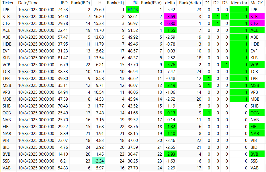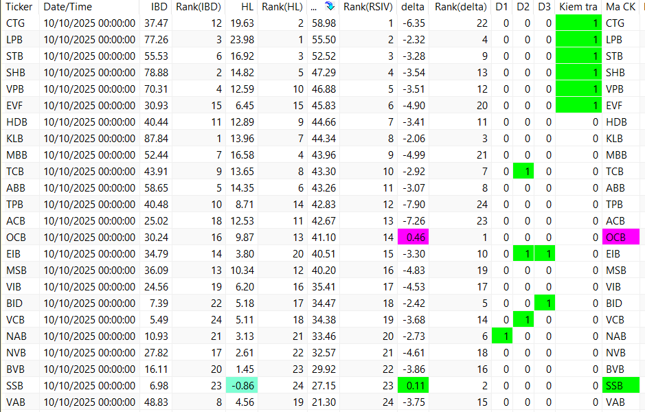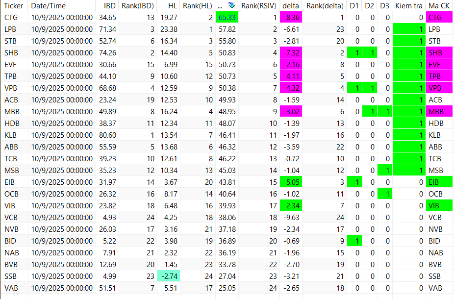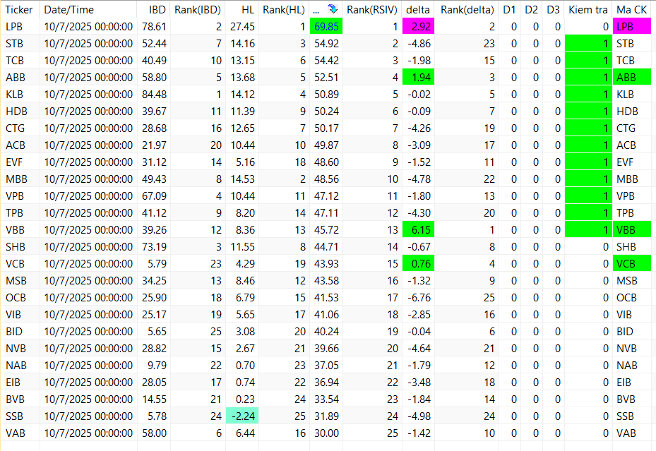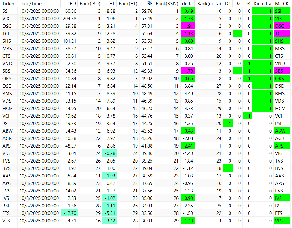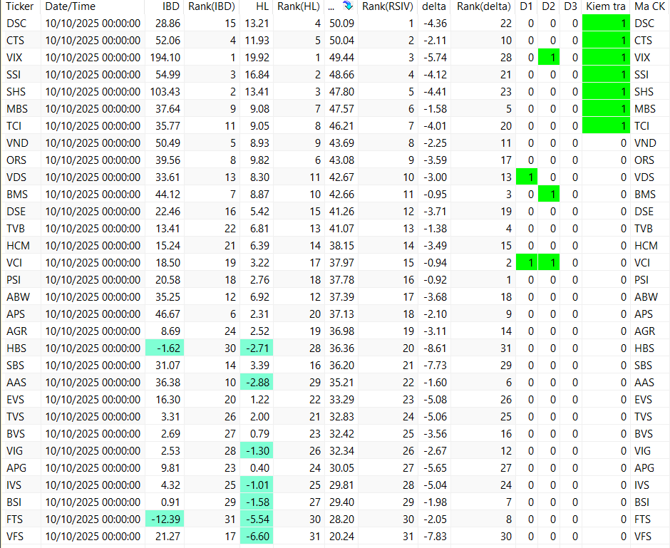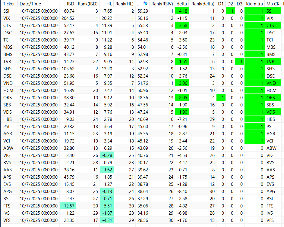 Các bảng trên đang được sắp xếp theo RSIV ( sức mạnh tương quan của cổ phiếu so với vnindex). Vậy nhìn từ trên xuống ta sẽ thấy các cổ phiếu khỏe hơn thị trường ở phía trên. Nên chọn trong top các cổ phiếu khỏe để khi tăng nó tăng tốt hơn thị trường và khi giảm nó giảm ít hơn thị trường.