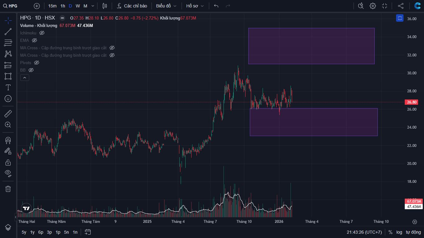 - Hỗ trợ và kháng cự: Hỗ trợ gần nhất ở giá 26.5, sâu hơn ở vùng 25.5-26. Kháng cự gần ở vùng 27.8-28.5, cao hơn là vùng 29.3-29.7.