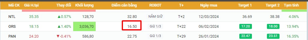 ORS được TOP khuyến nghị mua ngày 06/02 tại mức giá 15.9 >>> đạt 2 target ngắn hạn vào ngày 14/03 → Mức LN: ~14%, giữ lại 1/3 tỉ trọng theo dõi điểm cân bằng hàng ngày