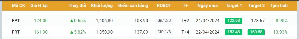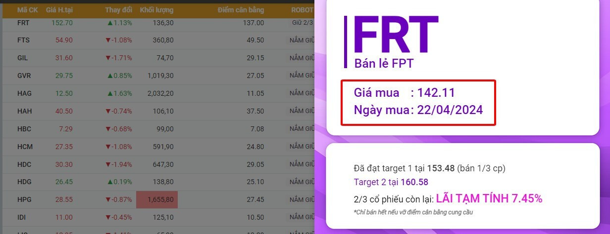 FRT là 1 trong các tín hiệu đầu tiên vươt điểm cân bằng có điểm mua lại hiện đã đạt ngay Target đầu tiên