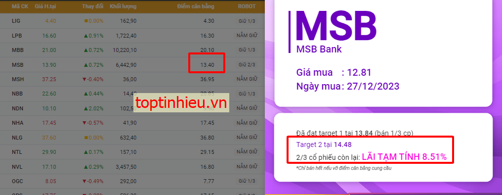 MSB điểm cân bằng hôm nay 13.55 , Target tiếp theo là 14.5