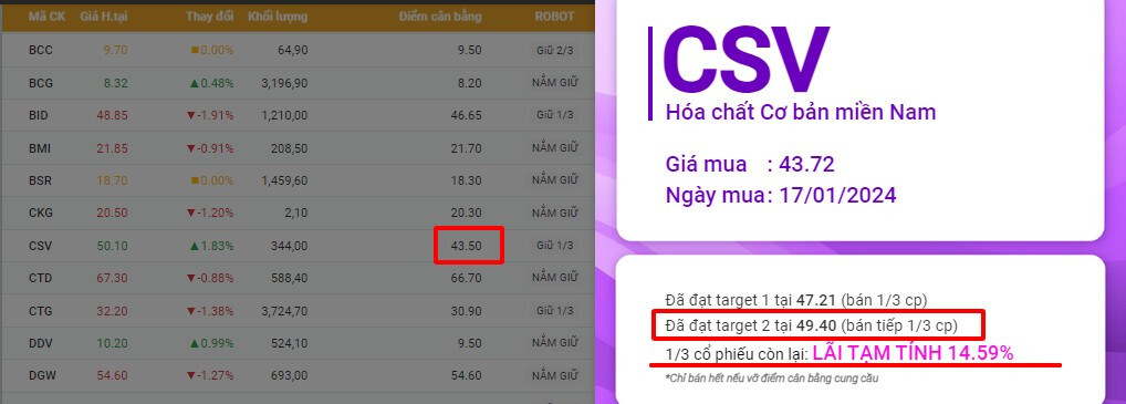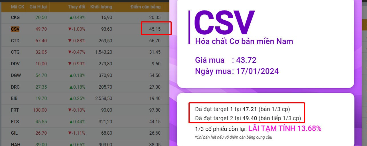 CSV đã đạt đủ 2 target sau khi phần mềm cho tín hiệu mua ngày 17/1. anh/chị nắm giữ 1/3 tỉ trọng chú ý theo dõi điểm cân bằng hàng ngày nhé ạ